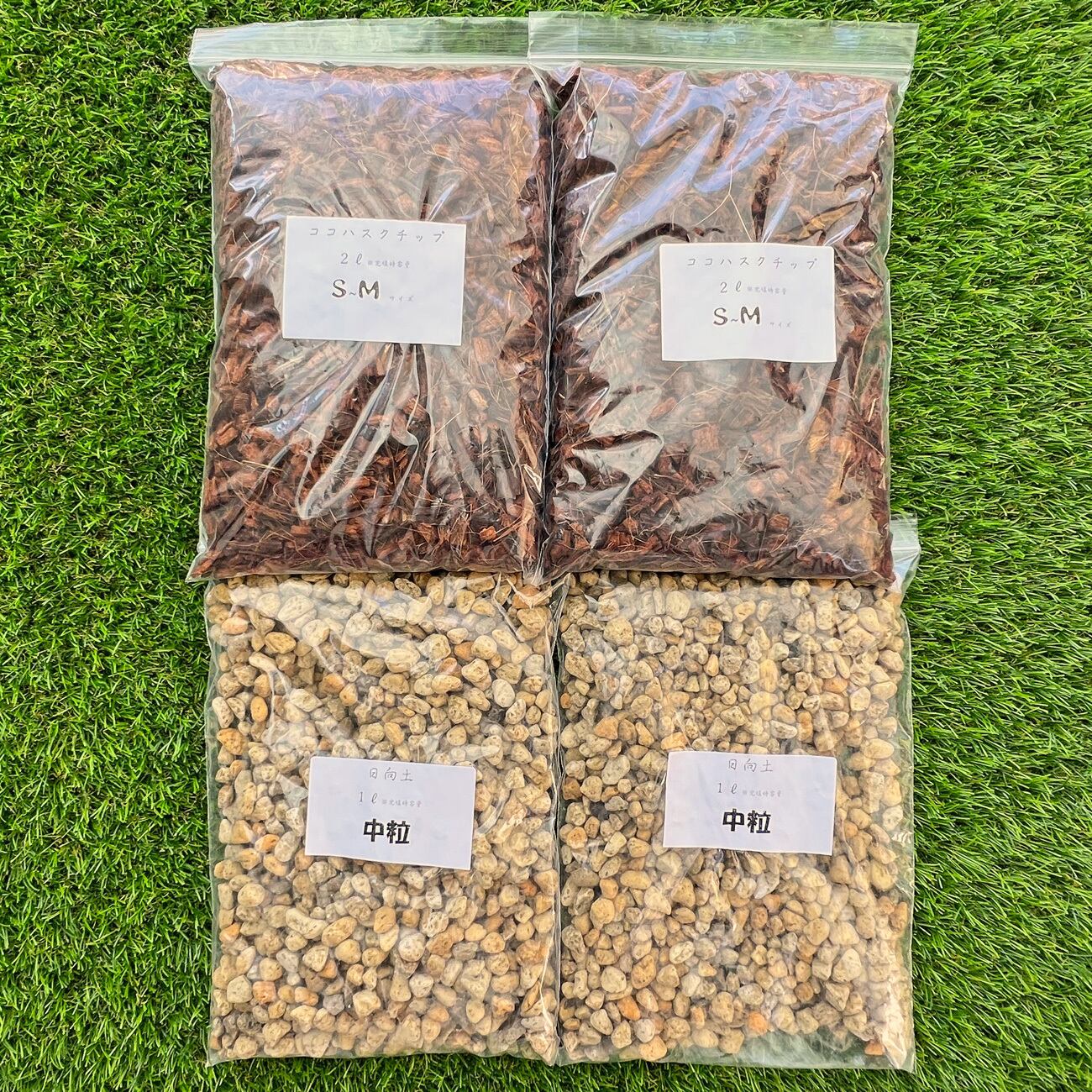 ココハスクチップ:日向土を2:1の割合で混ぜると観葉植物や多肉植物に適した配合用土になります。